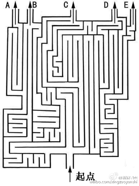 这是专供心理测验用的迷宫,起点只有一个,而出口有A、B、C、D、E五个。请拿起鼠标从起点开始进入迷宫,遇到岔路口时,不必多想,依直觉选择前行的方向即可。你所属的性格类型,与你最终到达的出口字母相同。如你从A走出迷宫,你便是“A型”。